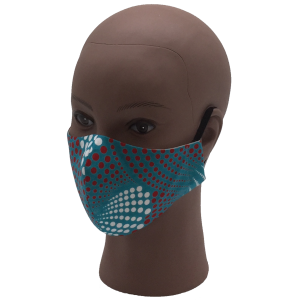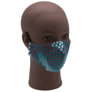This machine washable cloth face mask is manufactured with multiple layers of breathable, 100% cotton fabric including 3 layers of high thread count cotton poplin. The outer layer is an African print fabric with swirling dots in red and white on a turquoise background. This face mask is designed to fit facial contours, securely covering the nose and mouth and held in place with adjustable elastic ear bands.