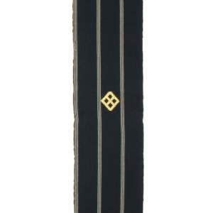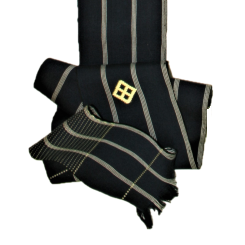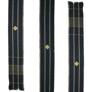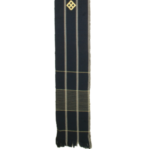 This simple deep blue Kente features fine vertical stripes throughout the length with sections of subtle horizontal stripes and hand embroidered motifs applied sparingly along the piece. This beautiful fabric is handwoven in Ghana by Bob Dennis Ahiagble and his weavers.